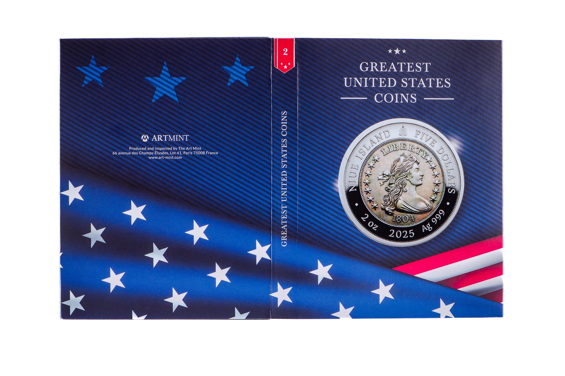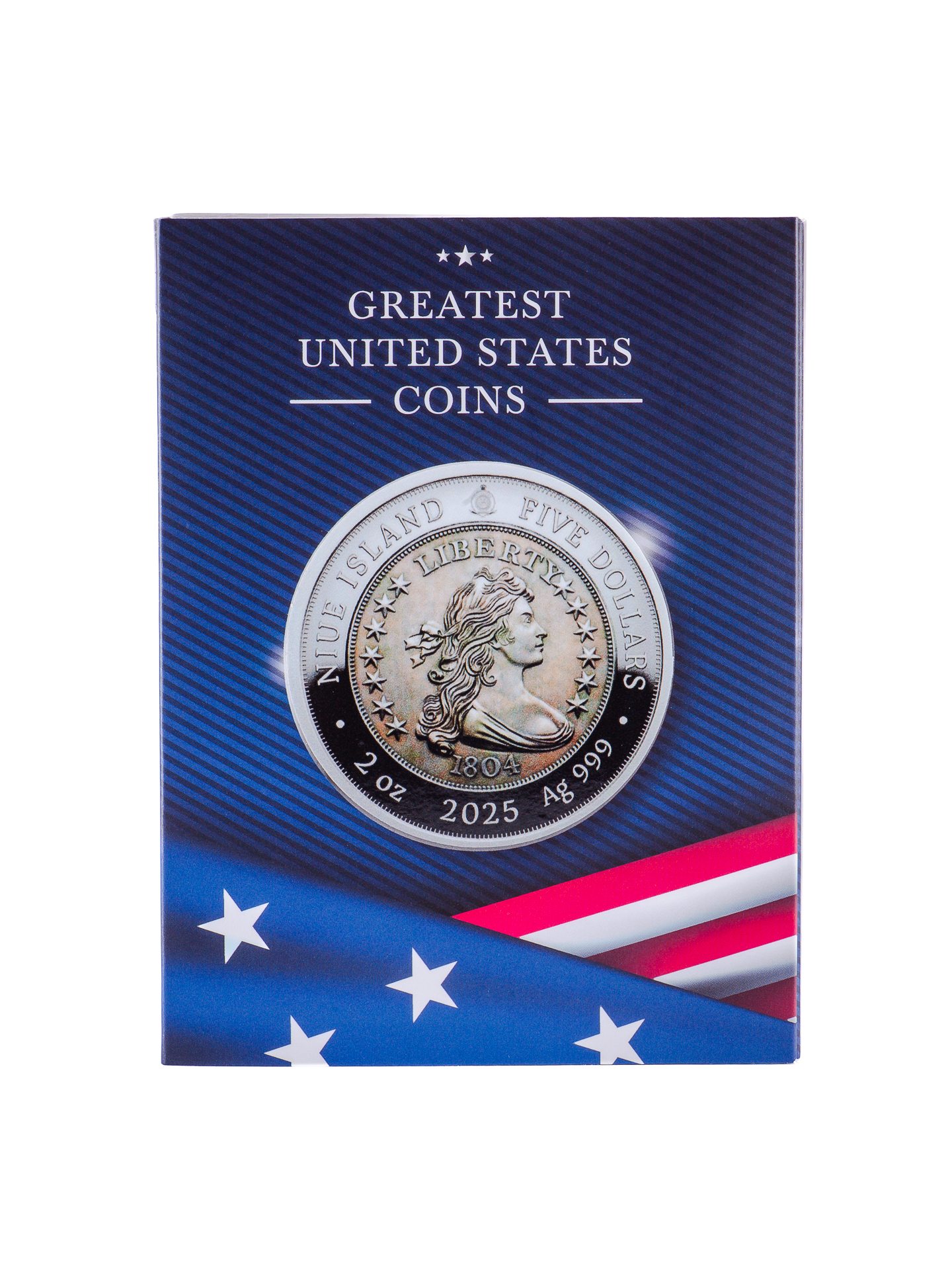 The obverse features a detailed reproduction of the classic Liberty portrait surrounded by 13 stars, with the date 1804 below. Around the rim, it bears the inscriptions โNiue Island,โ โFive Dollars,โ โ2025,โ โ2 oz,โ and โAg 999,โ indicating its issuer, face value, year, weight, and silver purity.
