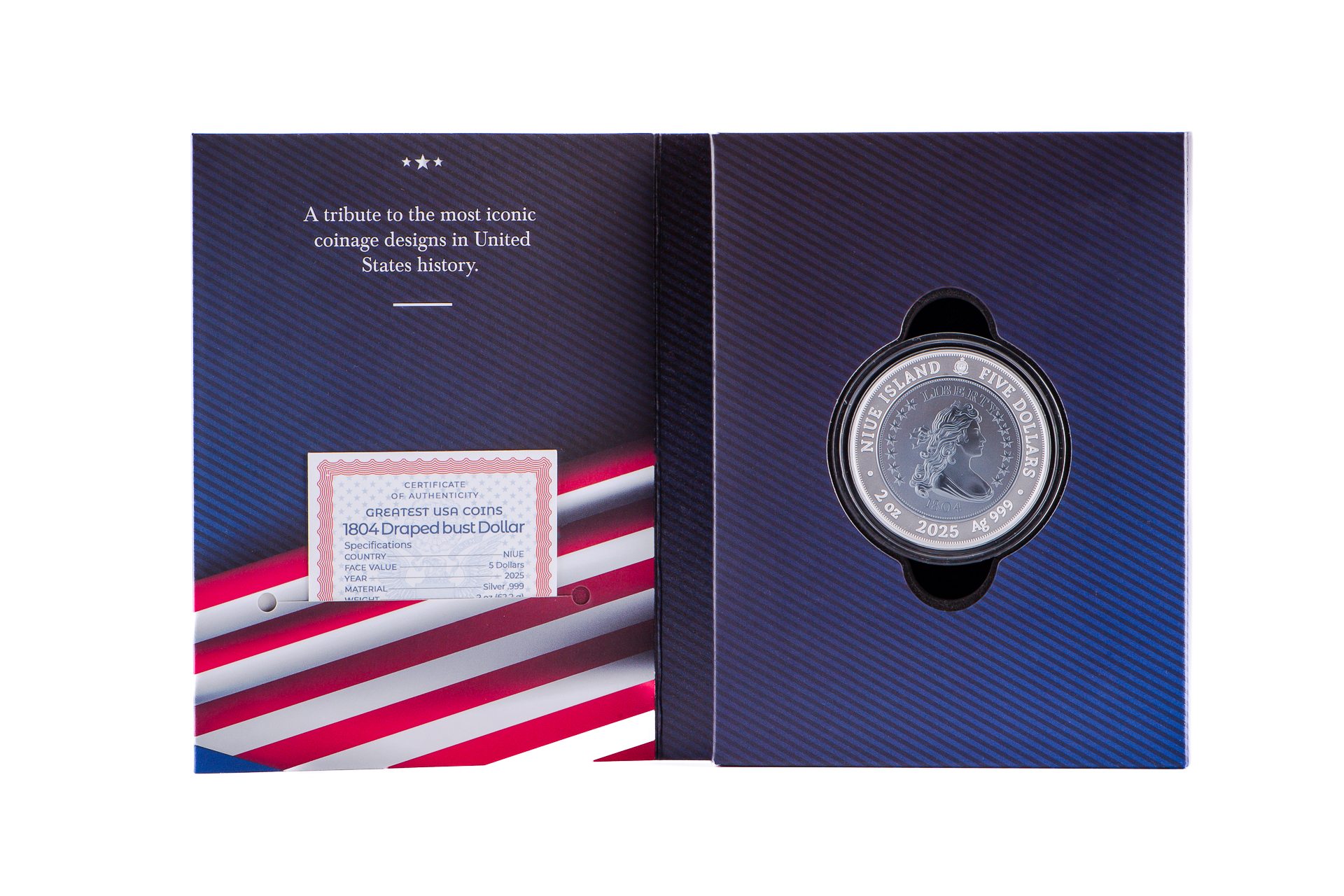 This modern coin pays tribute to the legendary 1804 Draped Bust Dollar, often called the โKing of American Coins.โ